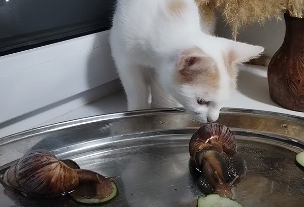 — У дома живут улитки ахатины,- рассказывает Юлия. — Эти моллюски стали довольно популярными домашними питомцами. Отличаются своим изяществом и миролюбивостью. Они обладают своим характером, а еще реагируют на голос хозяев. Вытягивают свои антенки и поворачивают их в разные стороны. Мне кажется, они так реагируют на вибрацию голоса, а ещё любят покушать и поспать, и за ними нужно приглядывать — склонны к побегам. Лучше держать улиток в контейнере, чем он больше, тем крупнее вырастет улитка. Наш кот Элиос любит за ними наблюдать, но не трогает, немного боится. Кстати, они довольно прожорливые, минут за пять могут огурец съесть, а купание — их любимая процедура.
