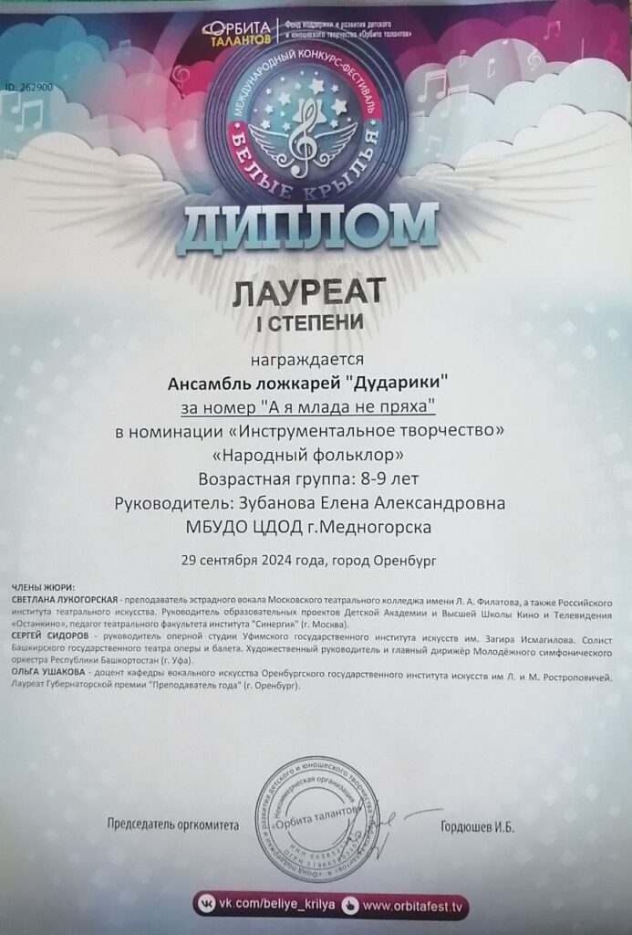 Участники ансамбля ложкарей «Дударики» (руководитель Зубанова Елена Александровна) Центра дополнительного образования детей г. Медногорска открыли новый учебный год не только многочисленными выступлениями на сценах города, но и победой в конкурсе. Младшая группа ансамбля стала лауреатом I степени в Международном конкурсе-фестивале «Белые крылья», проходившем 29 сентября в Оренбурге. Поздравляем ребят с заслуженной победой.