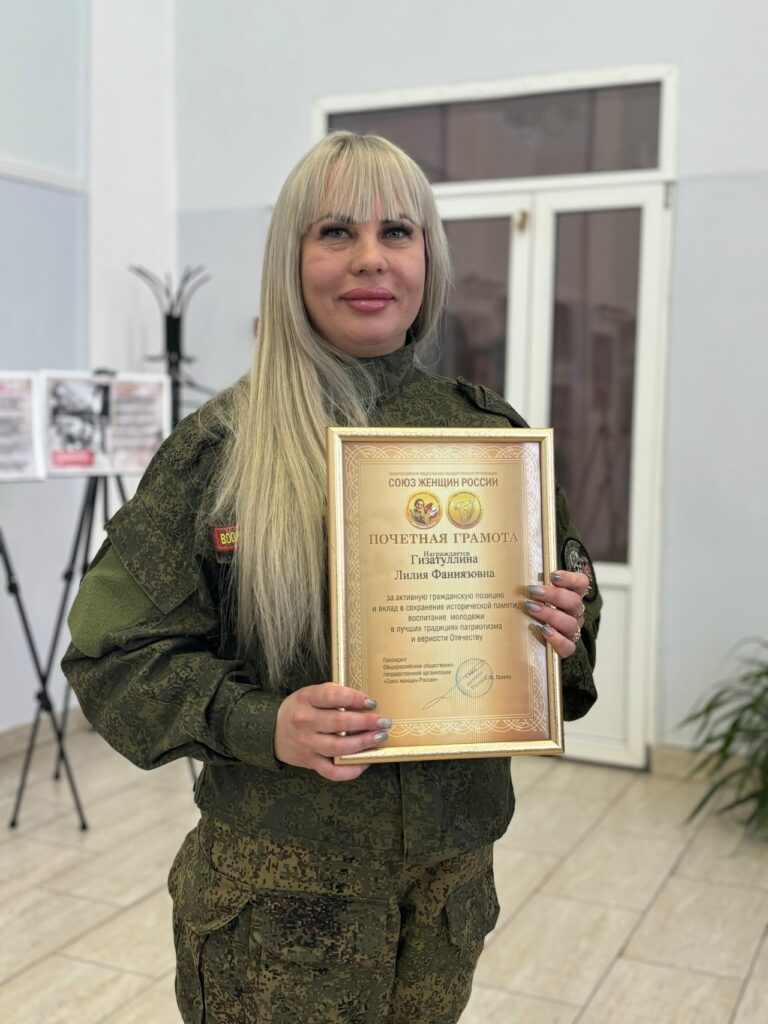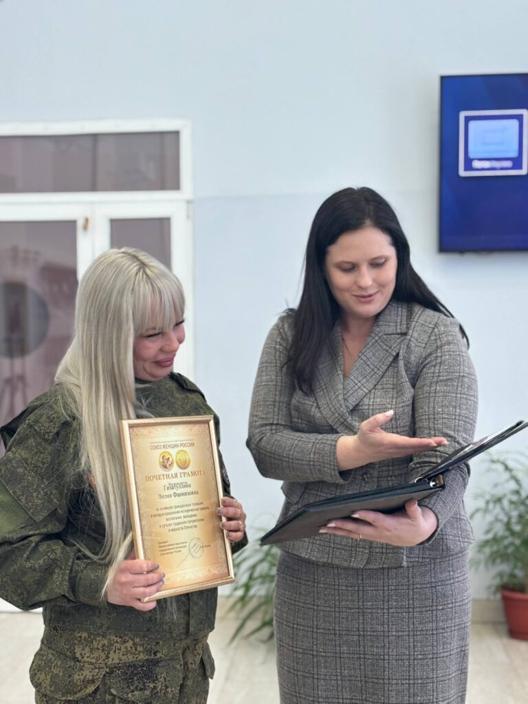 В торжественной обстановке Елена Сергеевна Мудрова вручила Лилии почетную грамоту Союза женщин России за её неоценимый вклад в общую Победу. Лилия — пример стойкости и верности долгу, которой мы искренне гордимся!