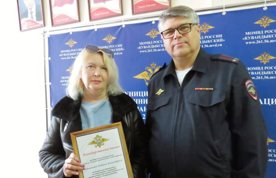За проявленную бдительность, неравнодушие к гражданам и за оказание содействия органам внутренних дел в борьбе с IT-преступлениям замначальника МО МВД России «Кувандыкский» Сергей Савостин вручил Наталье Гетмановой благодарственное письмо и ценный подарок.